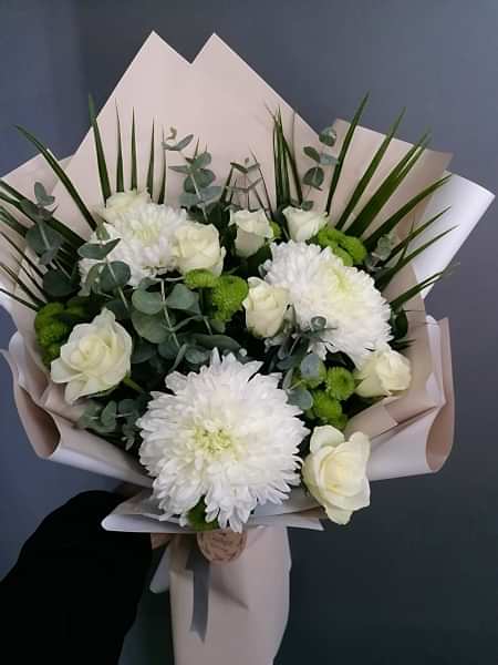 Çiçekgift floral designers ekibimizin sizler için yakınlarınıza harika bir hediyedir. 3 Beyaz anastasia , 7 beyaz gül, 4 dal yeşil krizantem ile okaliptus ve fenix ile tasarlanmıştır.