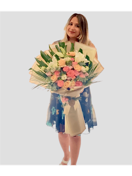 Çiçekgift Floral Designers ekibimizin özenle konseptini hazırladığı, harika ithal renkli güller ve beyaz lilyumdan bir bukettir.25 adet renkli gül ve beyaz lilyum, monstera yaprağı, fenix ve okaliptus ile hazırlanmıştır.