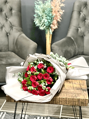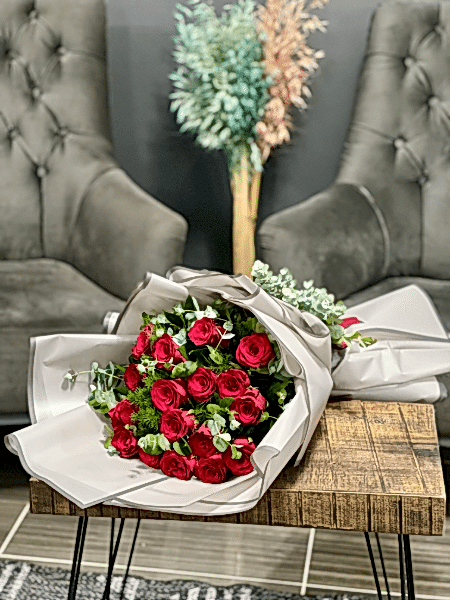Çiçekgift Floral Designers ekibimizin 20 adet kırmızı gül ve okaliptusten hazırladığı şık bir buket.