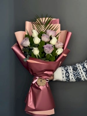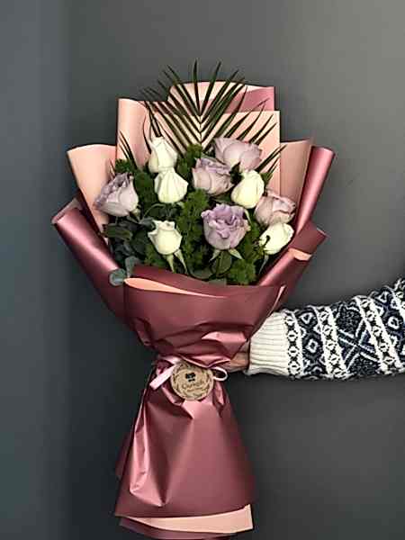 Çiçekgift floral designers ekibimizin sizler için yakınlarınıza hazırladığı beyaz ve lila güllerden oluşan bir bukettir. Toplam 10 adettir.