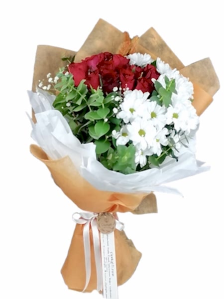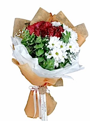 Floral Designers ekibimizin özenle konseptini hazırladığı, harika çiçeklerden bir derlemedir. Kırmızı güllerin(10 adet),beyaz papatya(4 dal) okaliptusle harmanlandığı kuru çiçek ile tasarlandığı özel çiçek buketidir.