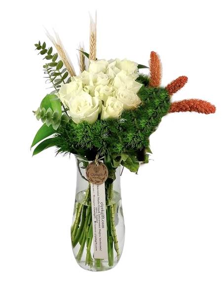 Çiçek Arajmanı, Floral Designers ekibimizin özenle konseptini hazırladığı, harika çiçeklerden bir derlemedir.Vazo da ithal beyaz güllerin(10 adet) ,yeşil biçme ve okaliptusle harmanlandığı kuru çiçek ile tasarlanan özel çiçek aranjmanıdır. Beyaz gül; saflığı ve masumiyeti ifade eder. Hediye edilecek kişiye duyduğunuz saygı ve hayranlığı simgeler.